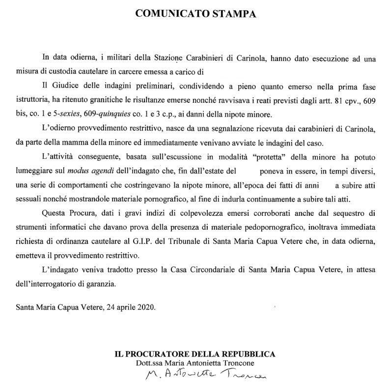 Pubblichiamo nota stampa della Procura della Repubblica di SMCV