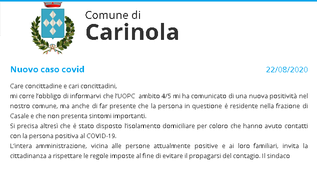 Lo apprendiamo dal sito ufficiale del Comune di Carinola.