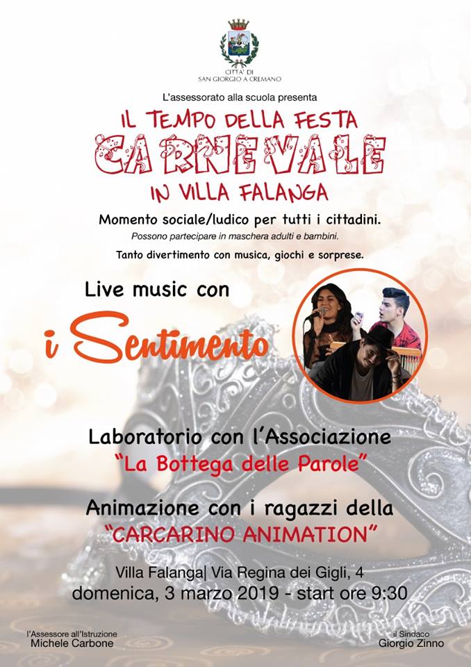 "Il Carnevale può essere una divertente occasione di condivisione per bambini e per adulti. Per questo su proposta dell'assessore alla Scuola, Michele Carbone e con il coordinamento del Laboratorio Regionale Città dei Bambini e delle Bambine, domenica 3 marzo dalle ore 9.30 alle 13.00, mettiamo a disposizione Villa Falanga per "IL TEMPO DELLA FESTA: CARNEVALE IN VILLA FALANGA". Una mattinata in maschera, dedicata alle famiglie sangiorgesi ma aperta anche a quelle di altri comuni durante la quale ci saranno momenti di musica con il gruppo I SENTIMENTO, animazione e laboratori a cura dell'Associazione LA BOTTEGA DELLE PAROLE e con la CARCARINO ANIMATION, giochi e sorprese."