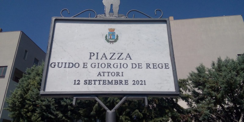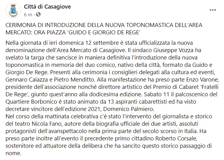 "Nella giornata di ieri domenica 12 settembre è stata ufficializzata la nuova denominazione dell'Area Mercato di Casagiove. Il sindaco Giuseppe Vozza ha svelato la targa che sancisce in maniera definitiva l'introduzione della nuova toponomastica in memoria del duo comico, nativo della città, formato da Guido e Giorgio De Rege. Presenti alla cerimonia i consiglieri delegati alla cultura ed eventi, Gennaro Caiazza e Pietro Menditto. Alla manifestazione ha preso parte Enzo Varone, presidente dell’associazione nonché direttore artistico del Premio di Cabaret ‘Fratelli De Rege’, giunto quest’anno alla dodicesima edizione. Sabato 11 il palcoscenico del Quartiere Borbonico è stato animato da 13 aspiranti cabarettisti ed ha visto decretare vincitore dell’edizione 2021, Domenico Palmiero. Nel corso della mattinata celebrativa c’è stato l’intervento del giornalista e storico del teatro Nicola Fano, autore della biografia ufficiale dei due artisti, assoluti protagonisti dell’avanspettacolo nella prima parte del secolo scorso in Italia. Ha preso parte inoltre all’evento il precedente primo cittadino Roberto Corsale, sostenitore ed attuatore della delibera che ha sancito questo storico passaggio di nome."