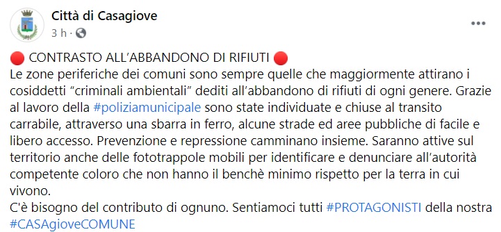 Questo quanto pubblicato sulla pagina fb del Comune di Casagiove: "CONTRASTO ALL’ABBANDONO DI RIFIUTI Le zone periferiche dei comuni sono sempre quelle che maggiormente attirano i cosiddetti “criminali ambientali” dediti all’abbandono di rifiuti di ogni genere. Grazie al lavoro della polizia municipale sono state individuate e chiuse al transito carrabile - si legge nella nota -, attraverso una sbarra in ferro, alcune strade ed aree pubbliche di facile e libero accesso. Prevenzione e repressione camminano insieme. Saranno attive sul territorio anche delle fototrappole mobili per identificare e denunciare all’autorità competente coloro che non hanno il benchè minimo rispetto per la terra in cui vivono. C'è bisogno del contributo di ognuno. Sentiamoci tutti PROTAGONISTI della nostra Casagiove"