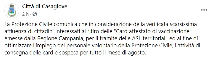 "La Protezione Civile comunica che in considerazione della verificata scarsissima affluenza di cittadini interessati al ritiro delle "Card attestato di vaccinazione" emesse dalla Regione Campania, per il tramite delle ASL territoriali, ed al fine- si legge nella nota- di ottimizzare l'impiego del personale volontario della Protezione Civile, l'attività di consegna delle card è sospesa per tutto il mese di agosto."