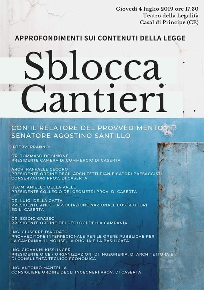 Si terrà giovedì 4 Luglio alle ore 17:30, a Casal di Principe, la relazione sul tema legge Sblocca Cantieri. Presso il Teatro della Legalità di Casal di Principe, approfondimenti sulla legge saranno illustrati dal relatore del provvedimento, il Senatore Agostino Santillo. Interverranno, il Presidente della Camera di Commercio di Caserta, il Presidente dell'Ordine dei Geologi della Campania e molti altri.