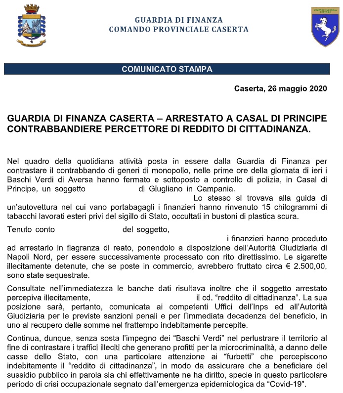 Pubblichiamo nota del Comando Provinciale Guardia di Finanza Caserta