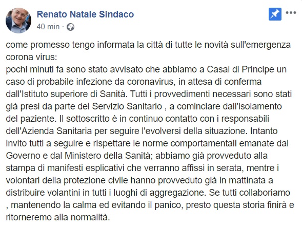 Questo quanto pubblicato sulla pagina facebook del Sindaco Natale: