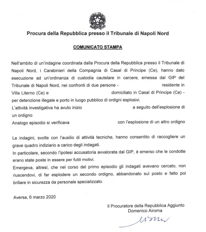 Questa parte della nota del Comando Provinciale dei Carabinieri di Caserta: