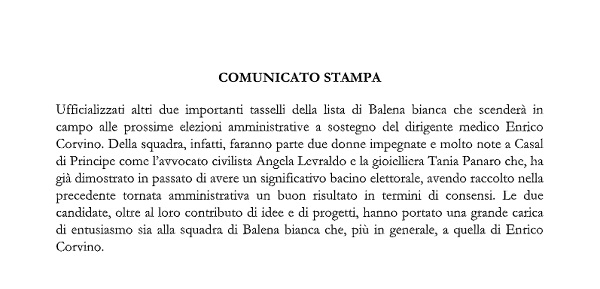 Questo il comunicato inviatoci dall'Ufficio Stampa di 'Balena Bianca'.