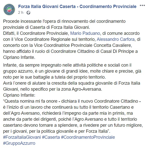 Questo quanto pubblicato sulla pagina facebook di Forza Italia Giovani Caserta: