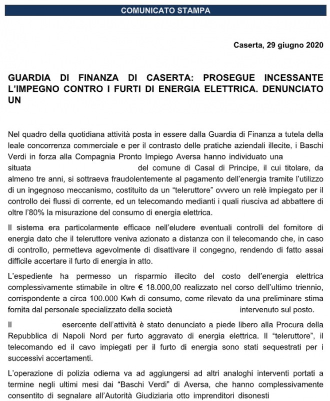 Casal di Principe. "Furto aggravato di energia elettrica". Uomo nei guai