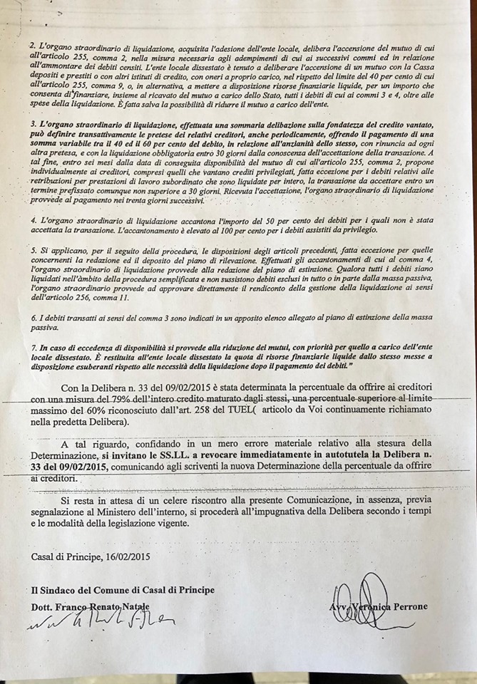 "A proposito di dissesto: in questi giorni gira sul web un documento che secondo i soliti leoni da tastiera dimostrerebbe che l'amministrazione non c'entra nulla con l'uscita dal dissesto. Il documento in questione è solo un atto iniziale della Commissione di liquidazione, quindi non dimostra proprio nulla. Bisogna ben conoscere l'intera vicenda burocratica e tutti i passaggi successivi, per poter esprimere un giudizio o una opinione. Ma conoscere la verità significherebbe impegnarsi, staccarsi un pò dal computer e fare le opportune verifiche. Si sarebbe potuto, allora, scoprire, che la Commissione di Liquidazione stava per chiudere il dissesto attraverso una transazione poco vantaggiosa per il Comune. Solo grazie al nostro intervento, abbiamo potuto chiedere la revoca della loro deliberazione ed avviare una trattativa per una transazione molto più conveniente per l'Ente. Non solo, infatti, la commissione ad un certo punto aveva chiuso le trattative con il nostro maggiore creditore (consorzio idrico), senza alcuno sconto e rinviando l'intero debito al Comune, con il rischio di un altro dissesto. Ma la nostra Amministrazione , attenta e competente, lo ha evitato. Quindi, come si vede, senza la nostra vigilanza, il nostro impegno e le nostre iniziative, oggi non avremmo ancora eliminato i debiti. IN ALLEGATO VI MOSTRO SOLO ALCUNI DEI DOCUMENTI CHE DIMOSTRANO IL NOSTRO PROTAGONISMO NELLA VICENDA."