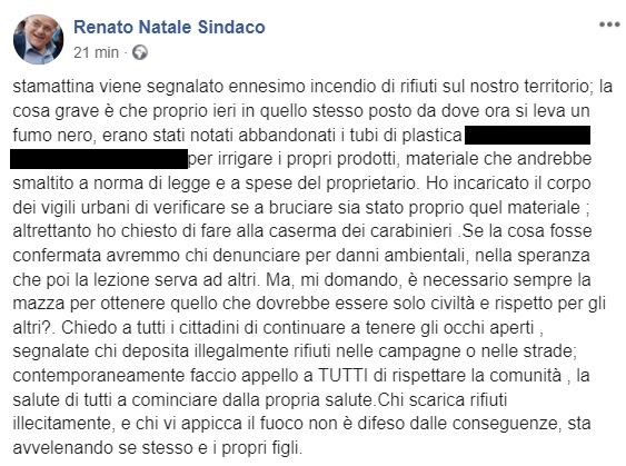 Questo quanto si legge dalla pagina Facebook del sindaco di Casal di Principe, Renato Natale: