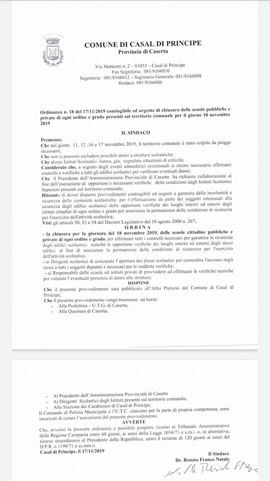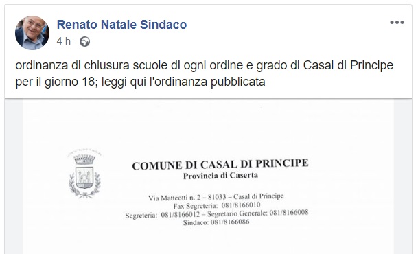 Questo quanto apprendiamo dalla pagina FB del Sindaco Natale