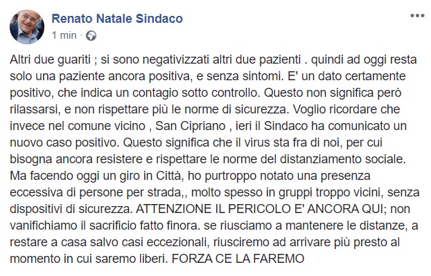 Questo quanto pubblicato sulla pagina facebook del Sindaco Natale: