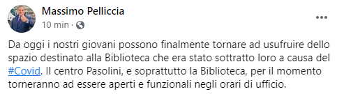 Questo il post pubblicato sulla sua pagina Facebook dal Sindaco di Casalnuovo Massimo Pelliccia: "Da oggi i nostri giovani possono finalmente tornare ad usufruire - si legge nel post - dello spazio destinato alla Biblioteca che era stato sottratto loro a causa del Covid. Il centro Pasolini, e soprattutto la Biblioteca, per il momento torneranno ad essere aperti e funzionali negli orari di ufficio".