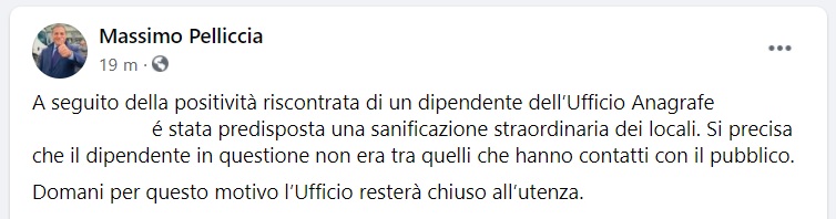 Questo quanto pubblicato sulla pagin afb del Sindaco di Casalnuovo: "A seguito della positività riscontrata di un dipendente dell’Ufficio Anagrafe ... - si legge nella nota - è stata predisposta una sanificazione straordinaria dei locali. Si precisa che il dipendente in questione non era tra quelli che hanno contatti con il pubblico. Domani - si legge nella nota - per questo motivo l’Ufficio resterà chiuso all’utenza."