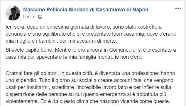 Casalnuovo. Minacciato di morte il Sindaco. "Si è presentato fuori casa mia"