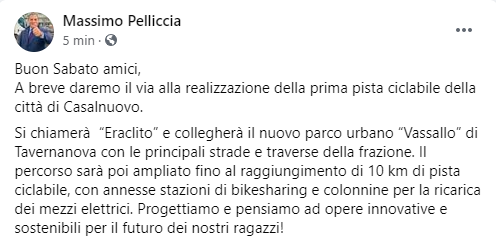 Lo ha annunciato il Sindaco Pelliccia attraverso la sua pagina Facebook: "Buon Sabato amici, a breve daremo il via alla realizzazione della prima pista ciclabile della città di Casalnuovo. Si chiamerà - si legge nel post - “Eraclito” e collegherà il nuovo parco urbano “Vassallo” di Tavernanova con le principali strade e traverse della frazione. Il percorso sarà poi ampliato fino al raggiungimento di 10 km di pista ciclabile, con annesse stazioni di bikesharing e colonnine per la ricarica dei mezzi elettrici. Progettiamo - conclude il post - e pensiamo ad opere innovative e sostenibili per il futuro dei nostri ragazzi".