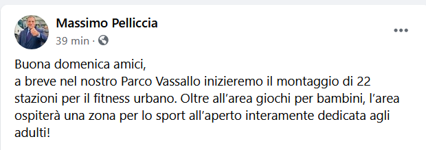 Questo il post pubblicato sulla pagina Facebook del sindaco di Casalnuovo, Massimo Pelliccia: "Buona domenica amici, a breve nel nostro Parco Vassallo inizieremo il montaggio di 22 stazioni per il fitness urbano. Oltre all’area giochi per bambini - si legge nel post - l’area ospiterà una zona per lo sport all’aperto interamente dedicata agli adulti"!