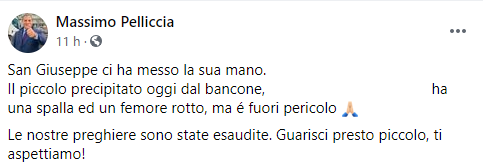 Questo parte del post pubblicato dal Sindaco di Casalnuovo Massimo Pelliccia sulla sua pagina Facebook nella tarda serata di ieri: "San Giuseppe ci ha messo la sua mano. Il piccolo precipitato oggi dal bancone (...) ha una spalla ed un femore rotto, ma é fuori pericolo. Le nostre preghiere sono state esaudite. Guarisci presto piccolo, ti aspettiamo!"
