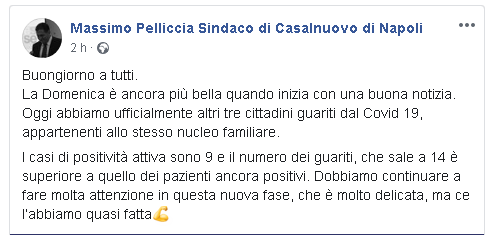"Buongiorno a tutti. La Domenica è ancora più bella quando inizia con una buona notizia. Oggi abbiamo ufficialmente altri tre cittadini guariti dal Covid 19, appartenenti allo stesso nucleo familiare. I casi di positività attiva sono 9 e il numero dei guariti, che sale a 14 è superiore a quello dei pazienti ancora positivi. Dobbiamo continuare a fare molta attenzione in questa nuova fase, che è molto delicata, ma ce l’abbiamo quasi fatta".