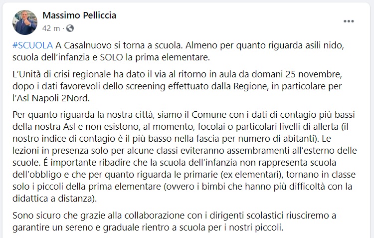 Questo quanto pubblicato sulla pagina fb del Sindaco di Casalnuovo