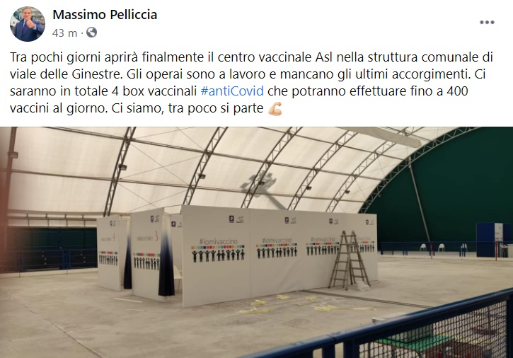 Questo quanto pubblicato sulla pagina fb del Sindaco Pelliccia: "Tra pochi giorni aprirà finalmente il centro vaccinale Asl nella struttura comunale di viale delle Ginestre. Gli operai - si legge nella nota - sono a lavoro e mancano gli ultimi accorgimenti. Ci saranno in totale 4 box vaccinali antiCovid che potranno effettuare fino a 400 vaccini al giorno. Ci siamo, tra poco si parte"