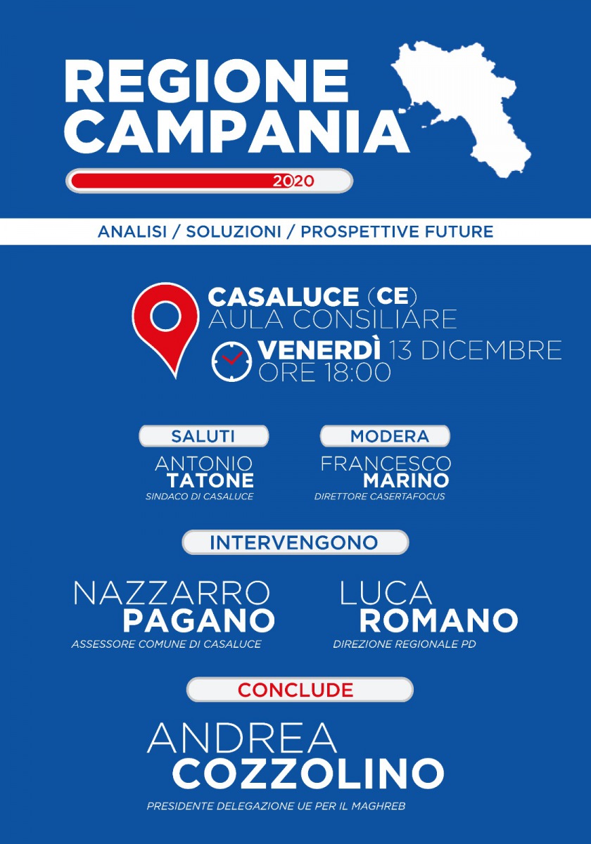 Questa è la nota stampa giunta in redazione. "Regione Campania 2020; analisi, soluzioni, prospettive future: è questo il tema al centro dell’incontro pubblico in programma per venerdì 13 dicembre presso la sala consiliare del Comune di Casaluce. L’appuntamento è per le ore 18 quando, a prendere la parola sarà il padrone di casa, il sindaco di Casaluce Antonio Tatone - si legge nella nota - al quale sarà affidato il compito di introdurre i lavori. Ad entrare nel merito delle questioni, invece, l’assessore e già sindaco di Casaluce Nazzaro Pagano e il componente della direzione regionale del Partito democratico Luca Romano. Le conclusioni, invece spetteranno - prosegue il comunicato - all’eurodeputato Andrea Cozzolino, presidente delegazione Ue per il Maghreb. «Per avere una pianificazione territoriale efficace è necessario che le autonomie locali costruiscano un asse istituzionale con l’ente Regione e con l’Europa in modo da cogliere le occasioni di finanziamento che da questi enti possono arrivare – ha sottolineato l’on. Cozzolino – questa è l’unica strada che i Comuni hanno - si legge nella nota - per mettere in campo una progettazione che non si limiti solo ad affrontare la gestione ordinaria della cosa pubblica, ma che anzi guardi ad un modello di sviluppo intercomunale con una visione del territorio per macro-aree. Il prossimo anno diventa, in questa direzione, uno snodo importante sia perché si chiude la fase di finanziamenti 2014-2020 - conclude il comunicato - sia perché si devono gettare le basi, anche in considerazione delle scadenze elettorali, di una nuova stagione di programmazione politica»."