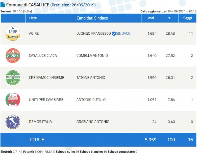 Concluso lo scrutinio a Casaluce, e Francesco Luongo è stato eletto Sindaco.