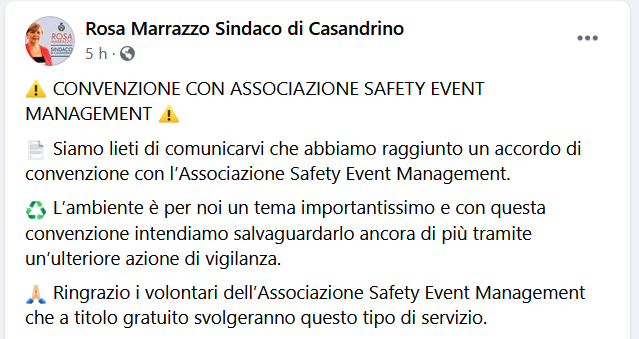 Questo il post pubblicato sulla pagina Facebook del sindaco di Casandrino, Rosa Marrazzo. "Siamo lieti di comunicarvi che abbiamo raggiunto un accordo di convenzione con l’Associazione Safety Event Management. L’ambiente è per noi un tema importantissimo e con questa convenzione intendiamo salvaguardarlo ancora di più tramite un’ulteriore azione di vigilanza. Ringrazio i volontari dell’Associazione Safety Event Management - conclude il post - che a titolo gratuito svolgeranno questo tipo di servizio.