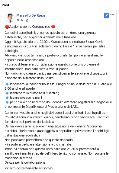 Lo apprendiamo dalla pagina Facebook di Marcello De Rosa, Sindaco di Casapesenna.