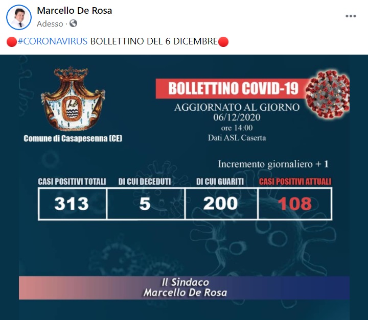 Questo quanto apprendiamo dalla pagina facebook del Sindaco De Rosa: