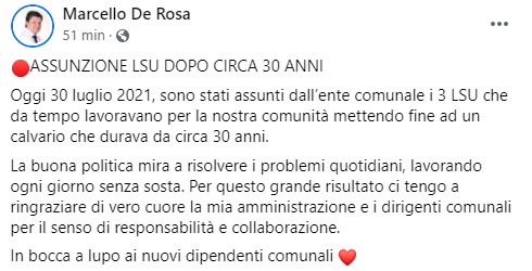 Questo il post pubblicato sulla sua pagina Facebook dal Sindaco di Casapesenna Marcello De Rosa: "ASSUNZIONE LSU DOPO CIRCA 30 ANNI. Oggi 30 luglio 2021, sono stati assunti dall’ente comunale i 3 LSU che da tempo lavoravano per la nostra comunità mettendo fine ad un calvario che durava da circa 30 anni. La buona politica - si legge nel post - mira a risolvere i problemi quotidiani, lavorando ogni giorno senza sosta. Per questo grande risultato ci tengo a ringraziare di vero cuore la mia amministrazione e i dirigenti comunali per il senso di responsabilità e collaborazione. In bocca a lupo - conclude il post - ai nuovi dipendenti comunali".