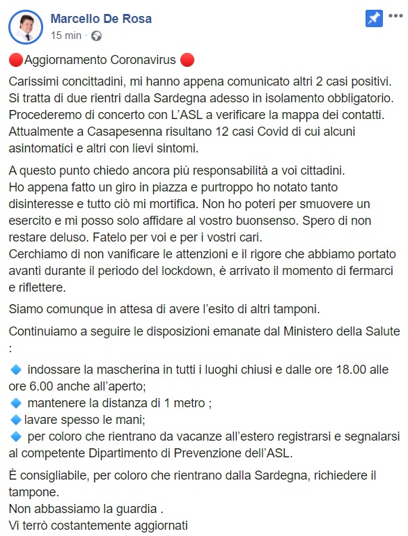 Questo quanto pubblicato sulla pagina facebook del Sindaco De Rosa: