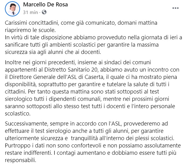 Questo quanto apprendiamo dalla pagina facebook del Sindaco De Rosa: