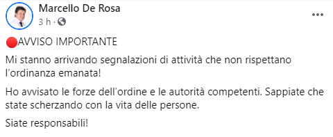 Questo il post pubblicato dal Sindaco di Casapesenna Marcello De Rosa sulla sua pagina Facebook: "Avviso importante. Mi stanno arrivando segnalazioni di attività che non rispettano l’ordinanza emanata! Ho avvisato le forze dell’ordine e le autorità competenti. Sappiate - conclude il Sindaco - che state scherzando con la vita delle persone. Siate responsabili!"
