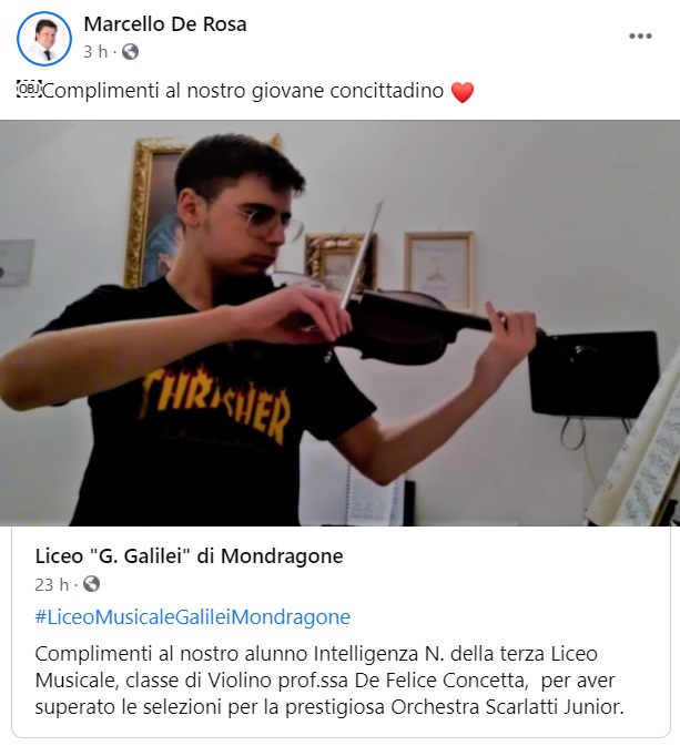 Liceo Musicale Galilei Mondragone Complimenti al nostro alunno Intelligenza N. della terza Liceo Musicale, classe di Violino prof.ssa De Felice Concetta, per aver superato le selezioni per la prestigiosa Orchestra Scarlatti Junior."