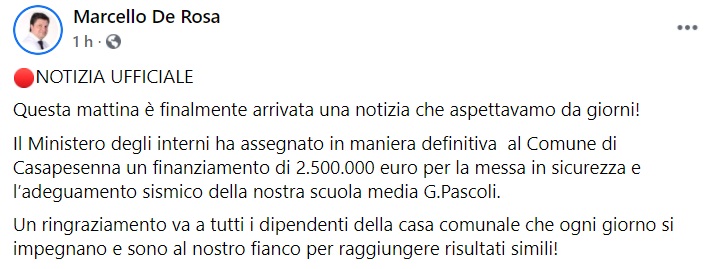 Questo quanto apprendiamo dalla pagina fb del Sindaco di Casapesenna De Rosa: "NOTIZIA UFFICIALE Questa mattina è finalmente arrivata una notizia che aspettavamo da giorni! Il Ministero degli interni ha assegnato in maniera definitiva al Comune di Casapesenna - si legge nella nota - un finanziamento di 2.500.000 euro per la messa in sicurezza e l’adeguamento sismico della nostra scuola media G.Pascoli. Un ringraziamento va a tutti i dipendenti della casa comunale che ogni giorno si impegnano e sono al nostro fianco per raggiungere risultati simili!"