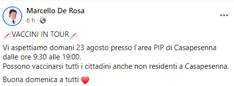 Questo il post pubblicato sulla sua pagina Facebook dal Sindaco di Casapesenna Marcello De Rosa: "Vaccini in tour. Vi aspettiamo domani 23 agosto presso l’area PIP di Casapesenna dalle ore 9:30 alle 19:00. Possono vaccinarsi - si legge nel post - tutti i cittadini anche non residenti a Casapesenna. Buona domenica a tutti".
