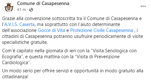 Questo il post pubblicato sulla pagina Facebook 'Comune di Casapesenna': "Grazie alla convenzione sottoscritta tra il Comune di Casapesenna e l'Avis Caserta, ma soprattutto con l’aiuto determinante dell’associazione Gocce di Vita e Protezione Civile Casapesenna, i cittadini di Casapesenna potranno usufruire periodicamente - si legge nel ppost - di visite specialistiche gratuite. Com’è capitato nella giornata di ieri con la “Visita Senologica con Ecografia”, e questa mattina con la “Visita di Prevenzione Cardiologica”. Un modo serio per offrire servizi - conclude il post - e opportunità in modo gratuito alla cittadinanza".