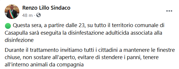 Questo il post pubblicato sulla pagina Facebook del sindaco di Casapulla, Renzo Lillo: "Questa sera, a partire dalle 23, su tutto il territorio comunale di Casapulla sarà eseguita la disinfestazione adulticida associata alla disinfezione. Durante il trattamento - si legge nel post - invitiamo tutti i cittadini a mantenere le finestre chiuse, non sostare all'aperto, evitare di stendere i panni, tenere all'interno animali da compagnia.