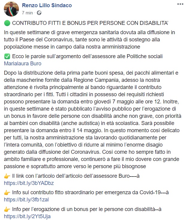 Questo quanto apprendiamo dalla apgina facebook del Sindaco Lillo: