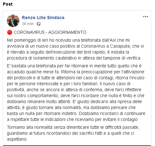 Nel pomeriggio di ieri ho ricevuto una telefonata dall’Asl che mi avvisava di un nuovo caso positivo al Coronavirus a Casapulla, che si è rilevato a seguito dell'esecuzione del test rapido; é iniziata la procedura di isolamento cautelativo in attesa del tampone di verifica. E’ bastata una telefonata per far ritornare in mente tutto quello che è accaduto qualche mese fa. Ritorna la preoccupazione per l'attivazione dei protocolli e di tutte le attenzioni nel caso di contagi, ritorna l’incubo per le persone interessate e per i loro familiari. Il nuovo caso di positività, anche se ancora in attesa di conferma, deve farci riflettere sul nostro comportamento, deve farci ricordare che nulla è finito e che dobbiamo rimanere molto attenti. E’ giusto dedicarsi alla ripresa delle attività, è giusto tornare alla normalità, ma dobbiamo pensare che basta un nulla per ritornare indietro. Dobbiamo ricordarci di continuare a rispettare tutte le indicazioni che riceviamo per evitare il contagio. Torniamo alla normalità senza dimenticare tutte le difficoltà passate, guardiamo al futuro ricordandoci dei sacrifici fatti e a quelli che ci aspettano".