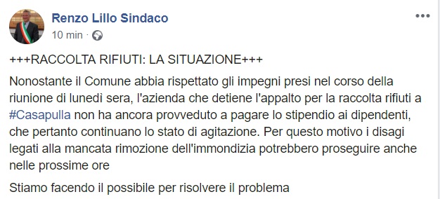 Questo quanto pubblicato sulla pagina Facebook del Sindaco di Casapulla, Renzo Lillo: