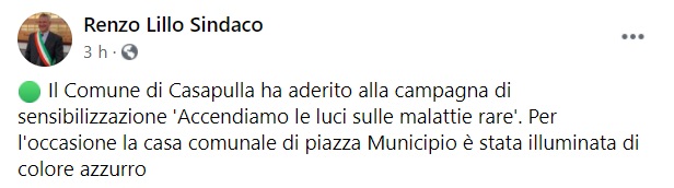 "Il Comune di Casapulla ha aderito alla campagna di sensibilizzazione 'Accendiamo le luci sulle malattie rare'. -Si legge nella nota- Per l'occasione la casa comunale di piazza Municipio è stata illuminata di colore azzurro"