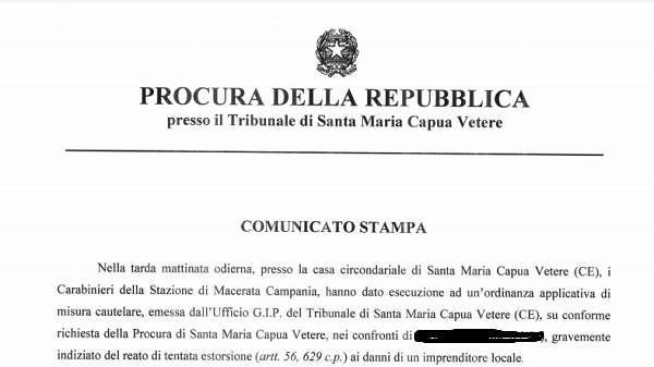 Questo parte del comunicato inviatoci dalla Procura della Repubblica presso il Tribunale di Santa Maria Capua Vetere.