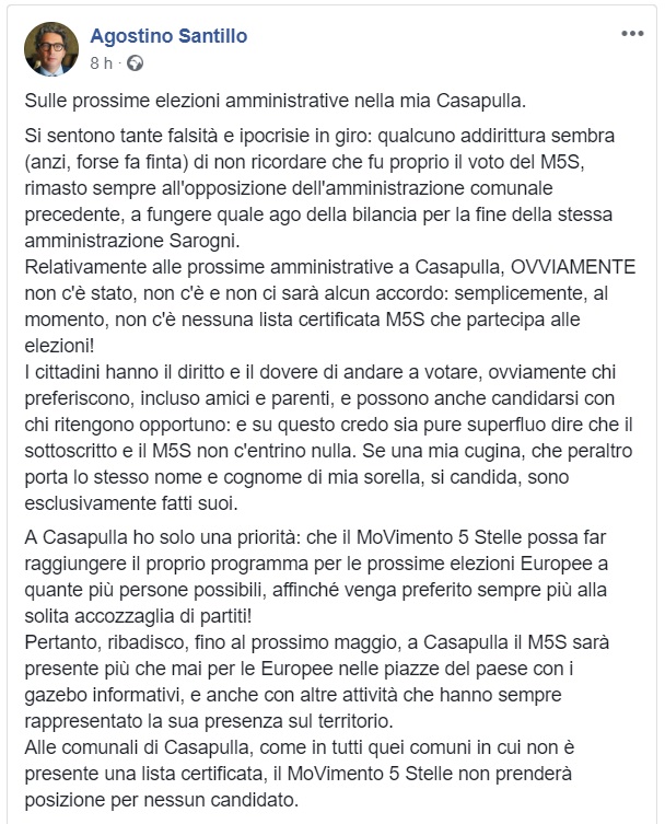 Questa la lunga riflessione del Senatore del Movimento 5 Stelle Agostino Santillo sulle prossime elezioni comunali a Casapulla.