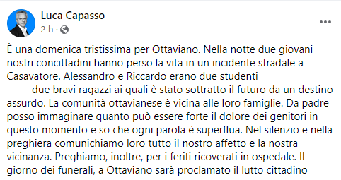 Questo parte del post pubblicato dal Sindaco di Ottaviano Luca Capasso sulla sua pagina Facebook: "È una domenica tristissima per Ottaviano. Nella notte due giovani nostri concittadini hanno perso la vita in un incidente stradale a Casavatore. Alessandro e Riccardo erano due studenti (...), due bravi ragazzi - si legge nel post - ai quali è stato sottratto il futuro da un destino assurdo. La comunità ottavianese è vicina alle loro famiglie. Da padre posso immaginare quanto può essere forte il dolore dei genitori in questo momento e so che ogni parola è superflua. Nel silenzio e nella preghiera comunichiamo loro tutto il nostro affetto - prosegue il post - e la nostra vicinanza. Preghiamo, inoltre, per i feriti ricoverati in ospedale. Il giorno dei funerali, a Ottaviano sarà proclamato il lutto cittadino".