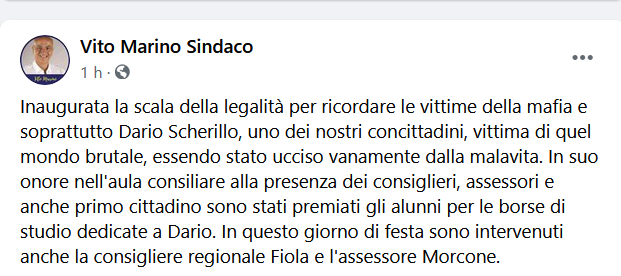 Questo il post pubblicato sulla pagina Facebook del sindaco di Casavatore Vito Marino: "Inaugurata la scala della legalità per ricordare le vittime della mafia e soprattutto Dario Scherillo, uno dei nostri concittadini, vittima di quel mondo brutale, essendo stato ucciso vanamente dalla malavita. In suo onore - si legge nel post - nell'aula consiliare alla presenza dei consiglieri, assessori e anche primo cittadino sono stati premiati gli alunni per le borse di studio dedicate a Dario. In questo giorno di festa sono intervenuti anche la consigliere regionale Fiola e l'assessore Morcone".