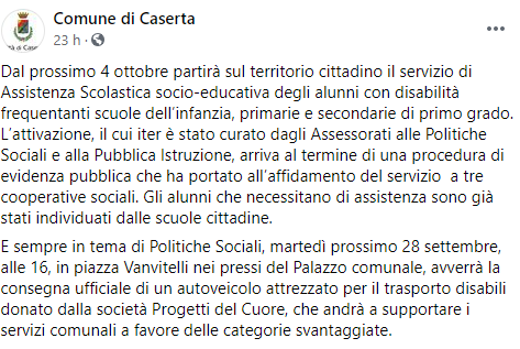 Questo il post pubblicato sulla pagina Facebook 'Comune di Caserta': "Dal prossimo 4 ottobre partirà sul territorio cittadino il servizio di Assistenza Scolastica socio-educativa degli alunni con disabilità frequentanti scuole dell’infanzia, primarie e secondarie di primo grado. L’attivazione, il cui iter è stato curato dagli Assessorati alle Politiche Sociali e alla Pubblica Istruzione, arriva - si legge nel post - al termine di una procedura di evidenza pubblica che ha portato all’affidamento del servizio a tre cooperative sociali. Gli alunni che necessitano di assistenza sono già stati individuati dalle scuole cittadine. E sempre in tema di Politiche Sociali - prosegue il post - martedì prossimo 28 settembre, alle 16, in piazza Vanvitelli nei pressi del Palazzo comunale, avverrà la consegna ufficiale di un autoveicolo attrezzato per il trasporto disabili donato dalla società Progetti del Cuore, che andrà a supportare i servizi comunali a favore delle categorie svantaggiate".