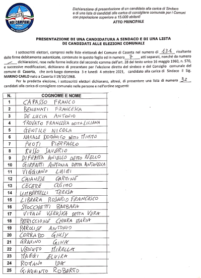 Questa la lista dei candidati consiglieri comunali di Noi Campani per le amministrative a Caserta, a sostegno del Sindaco Marino
